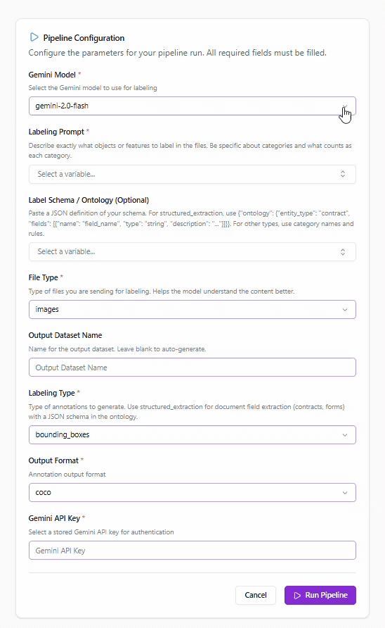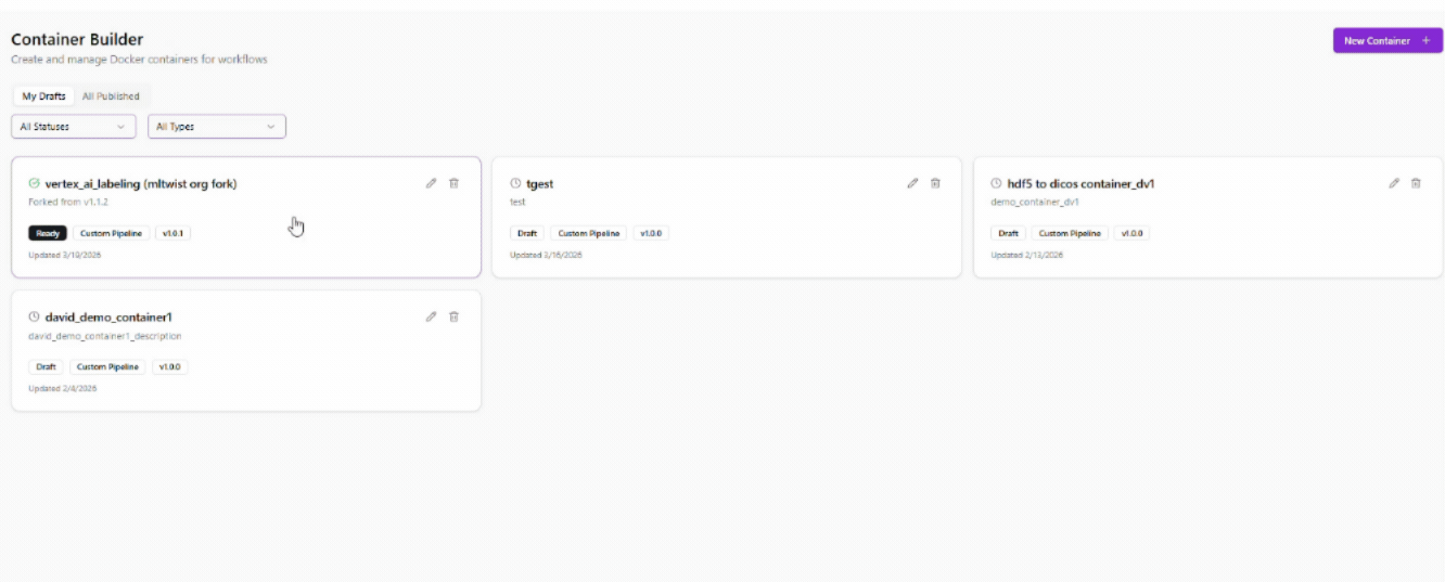 Twist AI Builder enables you to create custom data transformation containers tailored to your workflows. Choose from a library of pre-built Twists, from format conversion to LLM-powered prelabeling, or build your own to meet specific requirements. All custom Twists are securely scoped to your workspace, giving your team full control over how data is processed and prepared.