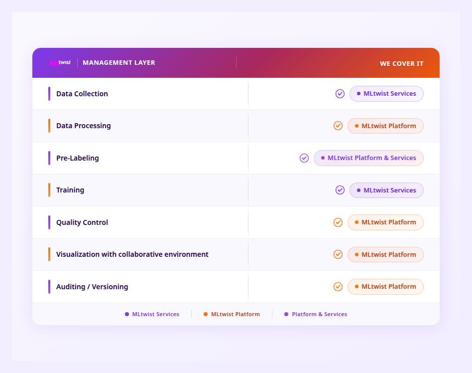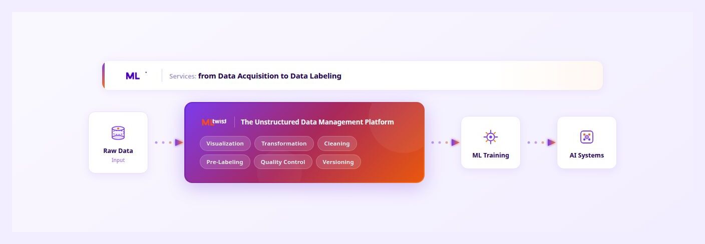 Through its integrated services for data acquisition and data labeling, MLtwist extends beyond software to cover the full end-to-end data preparation lifecycle. This allows teams to manage everything from real world data to delivering production-ready, annotated datasets from a single platform.